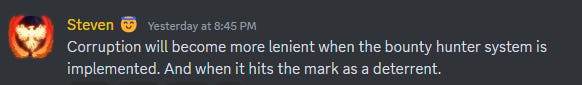 Steven joined the discussion on Discord, explaining how Corruption currently is only temporary: when the Bounty Hunter system comes into effect, Corruption penalties will be lessened.