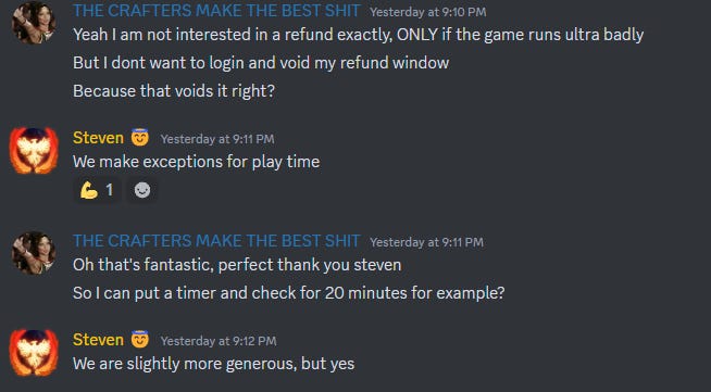 Steven jumped into the Discord and set things straight, mentioning that playtime will be taken into account for refund requests. While we’re unsure what the max playtime is, less than 20 minutes should be safe to request one should your performance be unplayable.